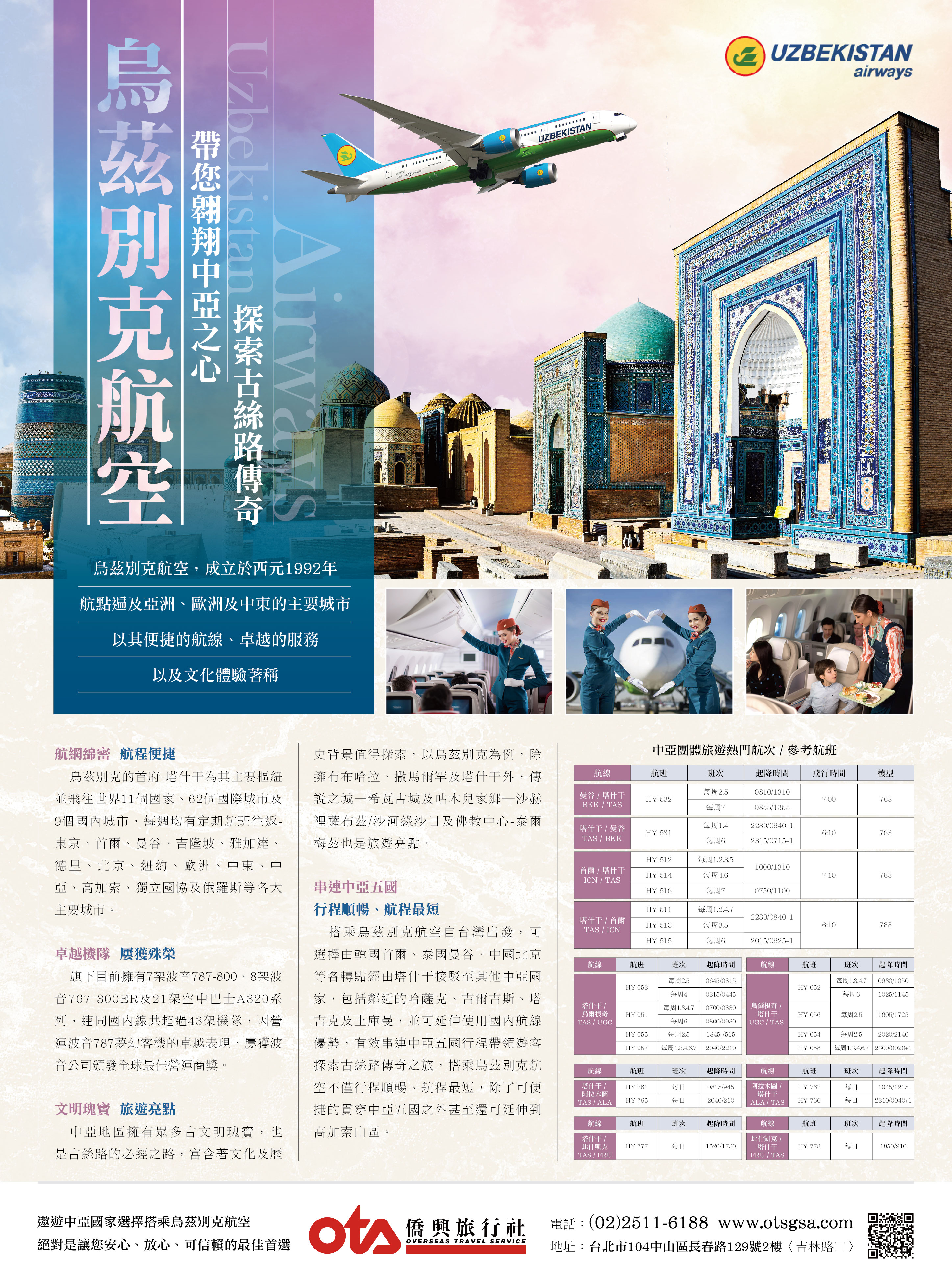 自台灣出發您可以選擇韓國首爾、泰國曼谷、北京...等各轉點轉機,而接駁便利的中亞各國航線以及烏茲別克國內線更是我們的優勢,讓您可以更加便利的貫通中亞五國甚至延伸到高加索山區,遨遊中亞國請選擇烏茲別克航空,我們絕對是您安心、放心、可以信賴的最佳選擇!