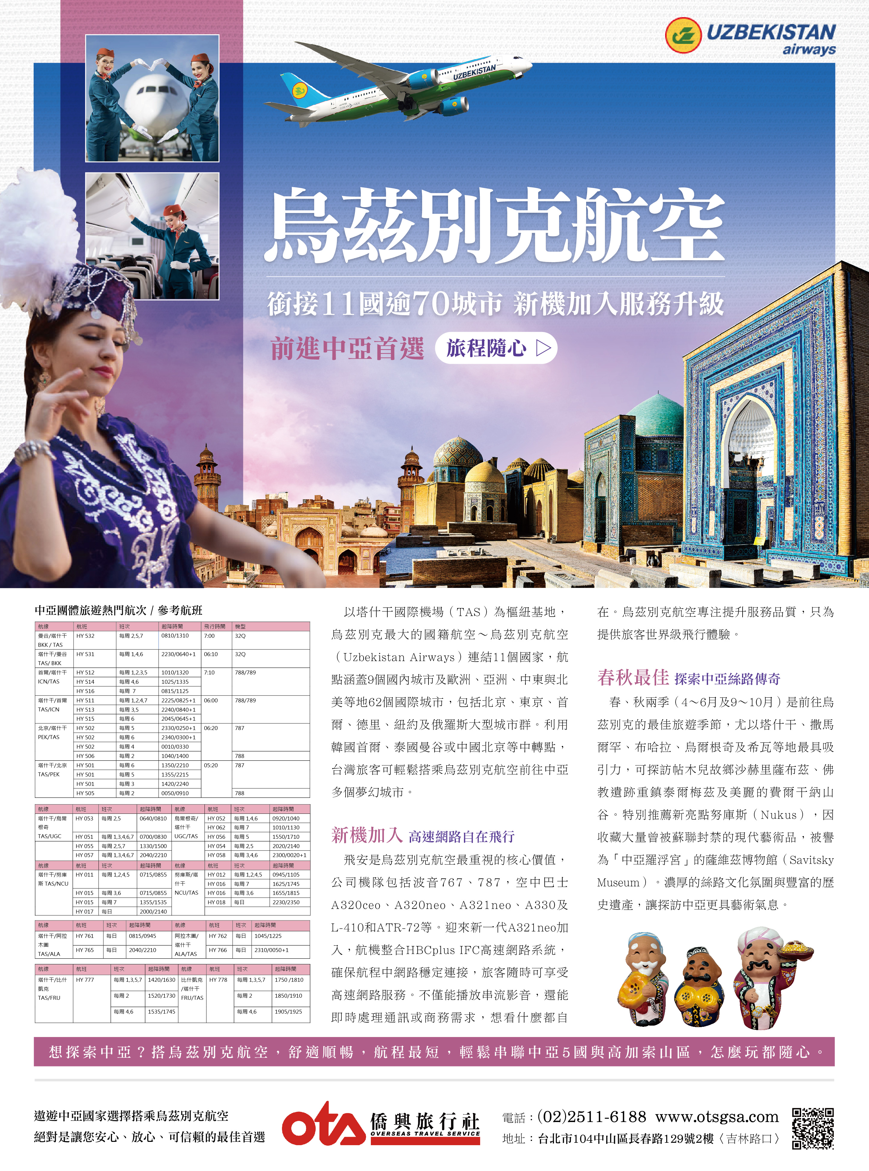 烏茲別克航空(Uzbekistan Airways)是中亞地區領先的航空公司,連接亞洲、歐洲和中東的主要城市,以其便捷的航線、卓越的服務以及文化體驗著稱。均以塔什干為樞紐飛往世界 11 個國家、41 個國際城市及 11 個國內城市─每週均有定期班次自東京、首爾、曼谷、吉隆坡、新加坡、德里、北京,飛往歐洲、中東、中亞、高加索、獨立國協及俄羅斯等各大主要城市!